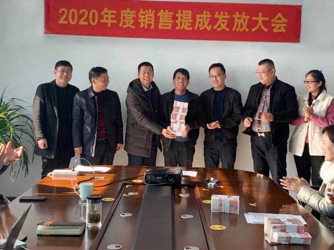 2021年1月2日,上午11點30分左右,河北鎂神科技股份有限公司在會議室召開業務員提成發放大會。一摞摞的紅色人民幣整齊的擺放在桌子上,看著..