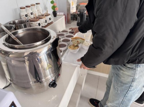 中午時(shí)分,食堂窗口前排起長(zhǎng)隊(duì)。紅棗、紅豆、花生米、蓮子、糯米等十余種食材經(jīng)過(guò)數(shù)小時(shí)熬煮,化作一碗碗熱氣騰騰的臘八粥迎接員工的到來(lái)。廚師們將臘八粥盛到每位員工碗中,員工們接過(guò)粥碗,笑容洋溢。